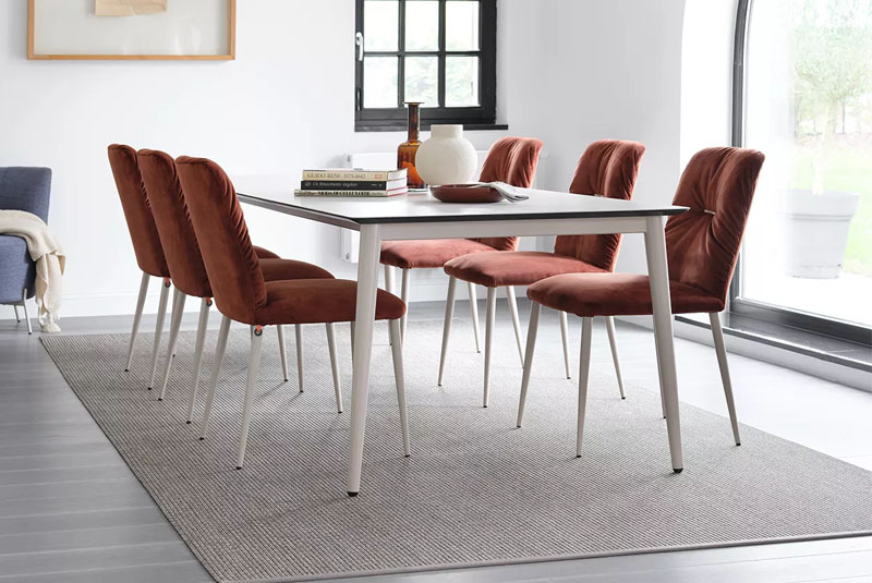 "Aura" fits perfectly into your home thanks to the large cover selection and the many possible leg colors in wood or metal - and a matching glider is available for every floor covering. In our furniture store you can configure the chair according to your wishes.