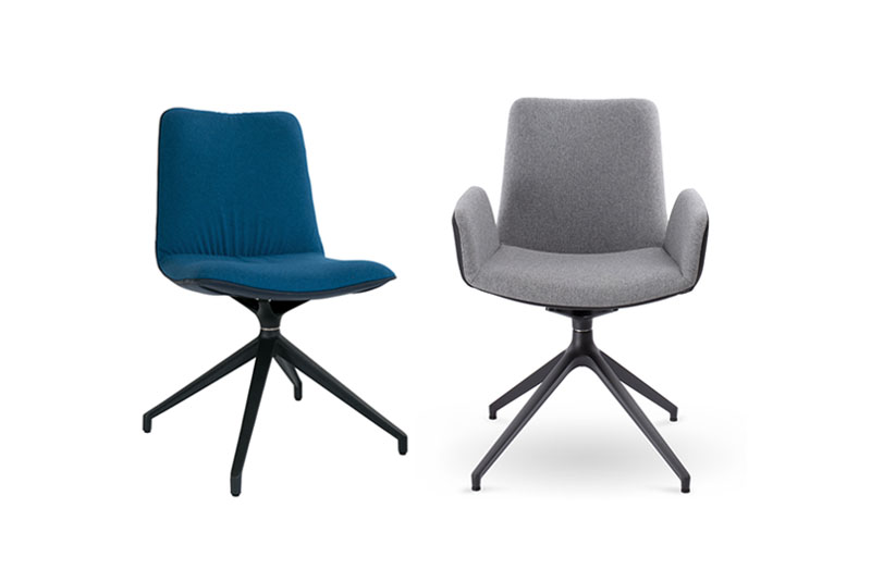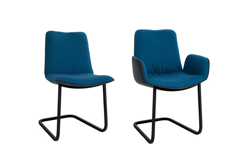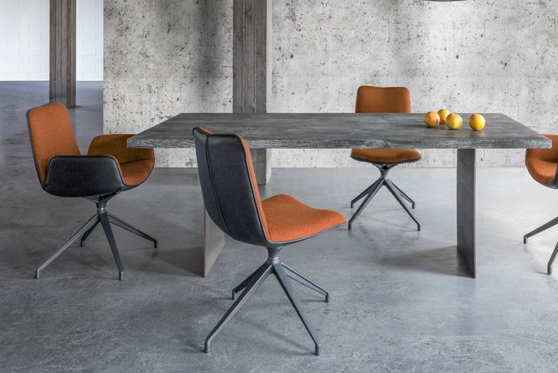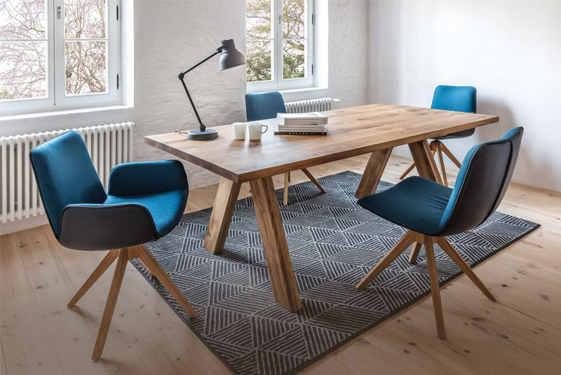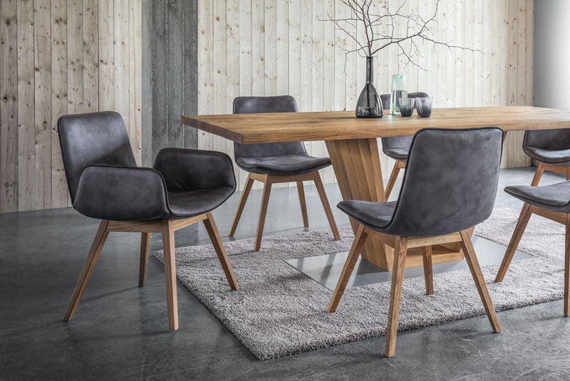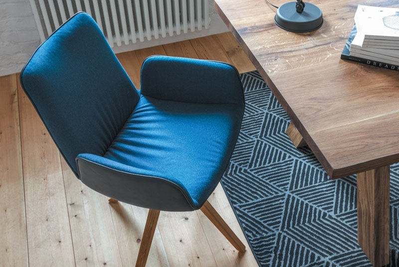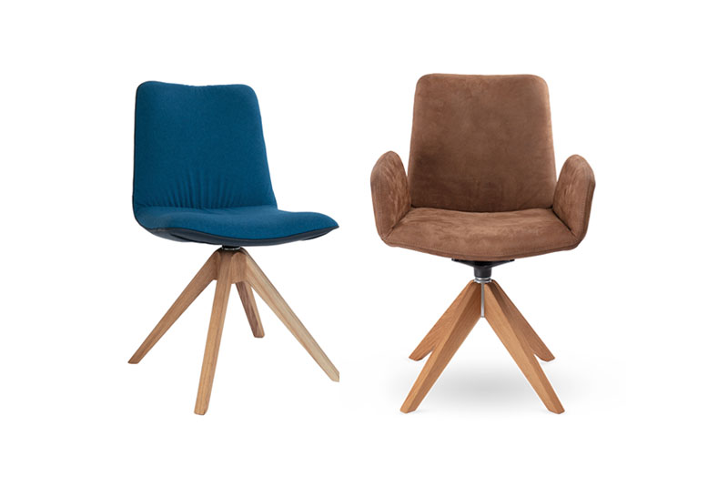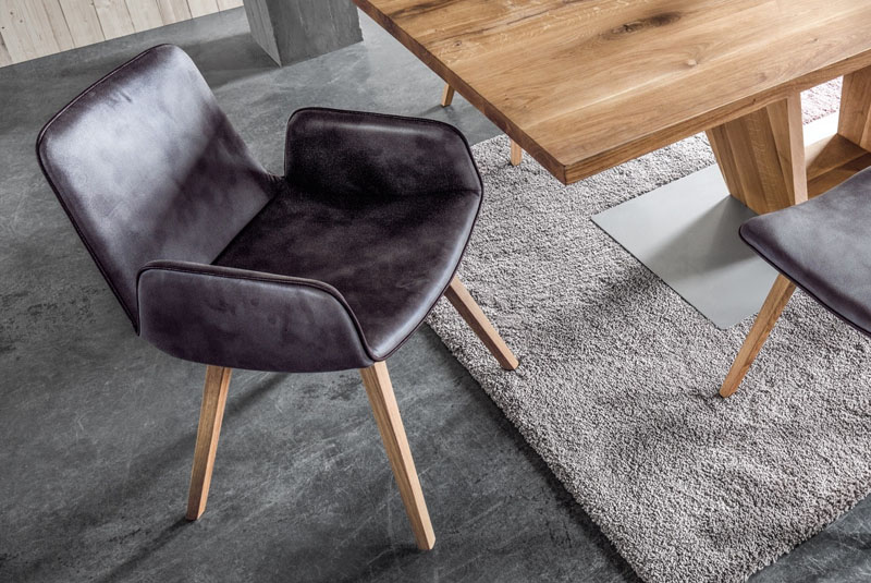 The timelessly designed chair "Merlo" has a rather firm seat upholstery and is also available with armrests on request. Take a look at the many possible fabric and leather covers for this chair in our furniture store in Berlin-Steglitz!