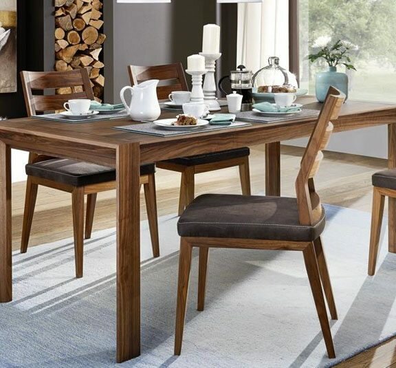 The special, triangular leg shape, combined with the smooth-running pull-out mechanism makes the dining table "Marie" a special gem in your four walls. Compose your desired table to the centimeter from different types of wood and on request with pull-out.