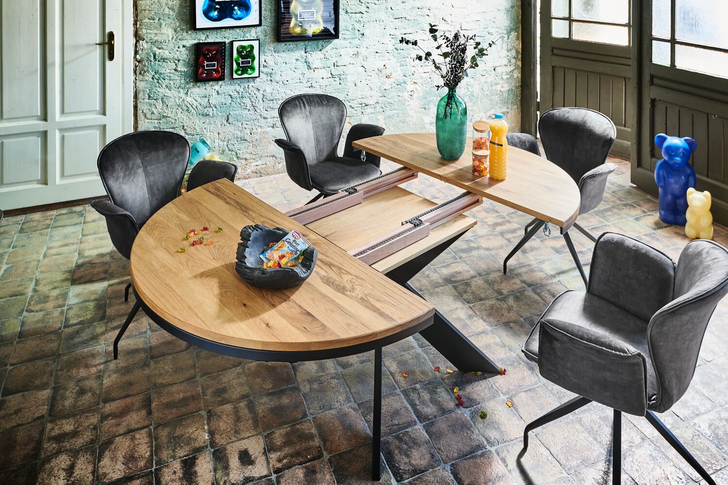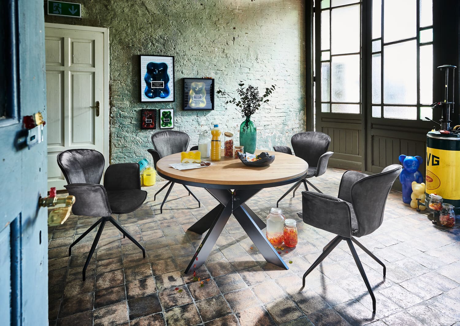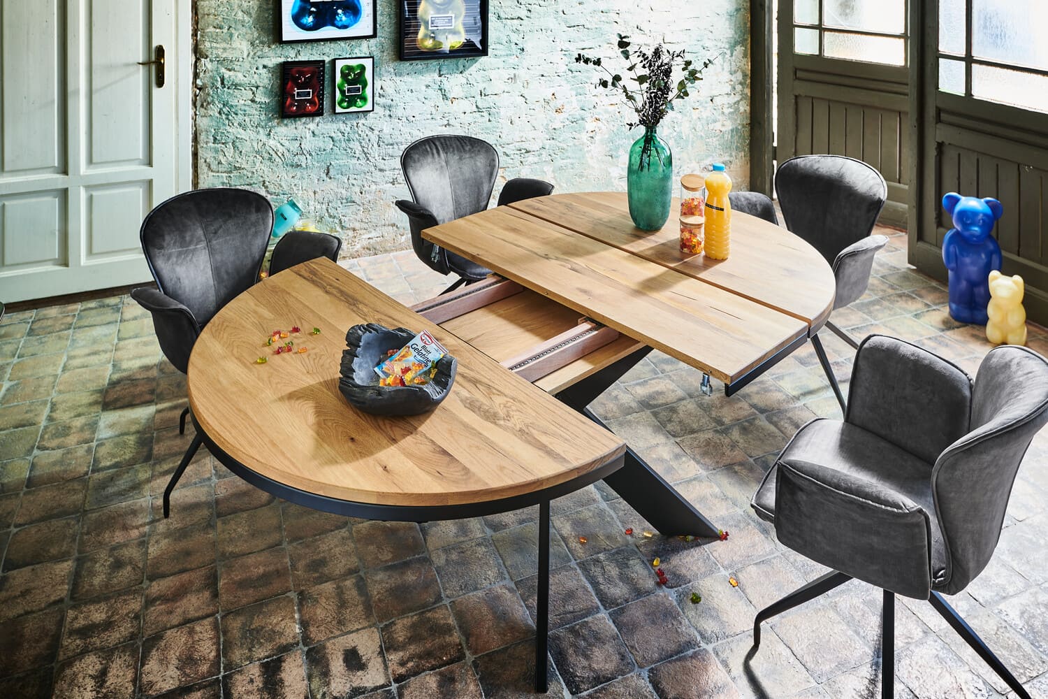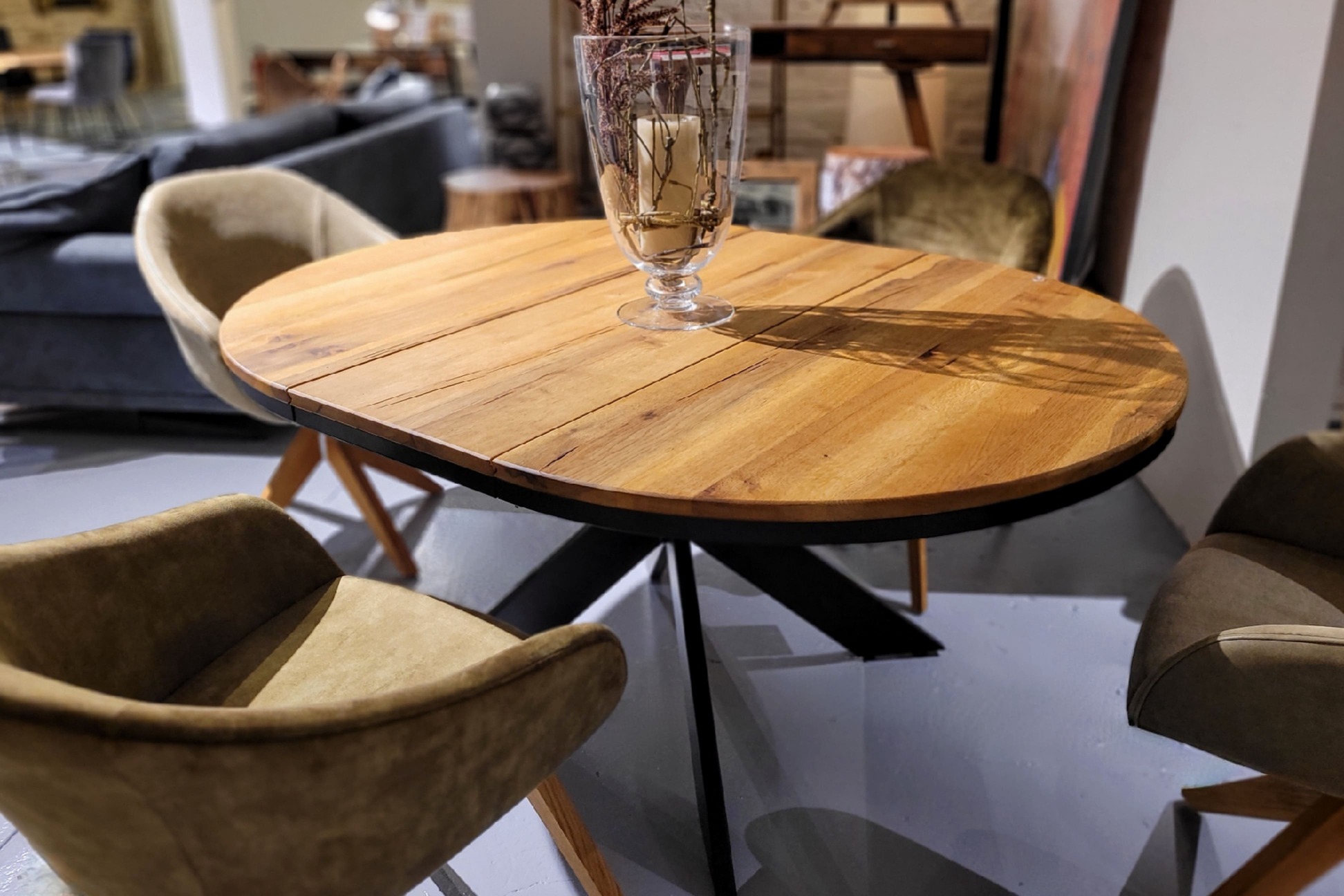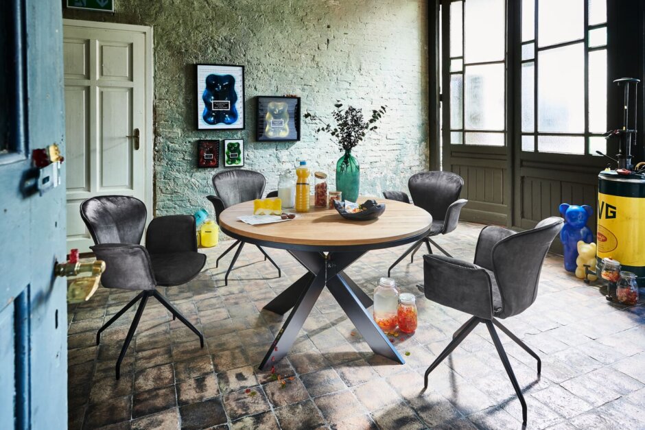 Die Mischung aus massiver, rustikaler Eiche als Tischplatte und einem Gestell aus schwarzem Metall macht den Tisch zeitlos und ideal für jedes Esszimmer. In den Durchmessern 120 und 130 cm, mit optionaler Einlegeplatte für 40 cm mehr Länge und in vielen Holzfarben erhältlich.