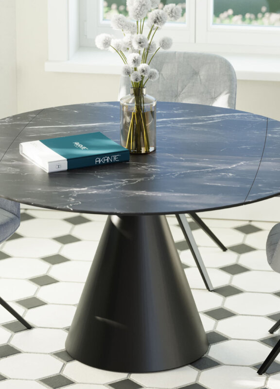 Der Esstisch Onyx überzeugt durch seine klare Formensprache und einen funktionalen Drehmechanismus. Die Tischplatte lässt sich durch eine integrierte Technik ausklappen – so entsteht im Handumdrehen mehr Fläche für Gäste oder Familienessen. Erhältlich in zwei Größen (95/135 × 135 cm oder 100/150 × 150 cm) bietet der Tisch Platz für bis zu acht Personen. Die Höhe variiert je nach Auszug: 77 cm im kompakten Zustand, 75 cm ausgeklappt. Die Basis besteht aus mattschwarz lackiertem Stahl – stabil, unempfindlich und standfest. In unserem Möbelhaus in Berlin-Steglitz beraten wir Sie gerne zu den verfügbaren 11 Keramikplattenfarben.