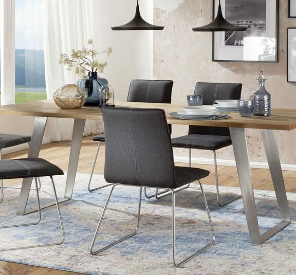 Dieser optisch leichte Esstisch im modernen Holz-Metall-Look sieht besonders gut mit Stühlen mit Füßen aus Edelstahl oder anderem Metall aus. Wählen aus vielen Maßen, zentimetergenau sowie aus verschiedenen Holzarten und Fußausführungen.