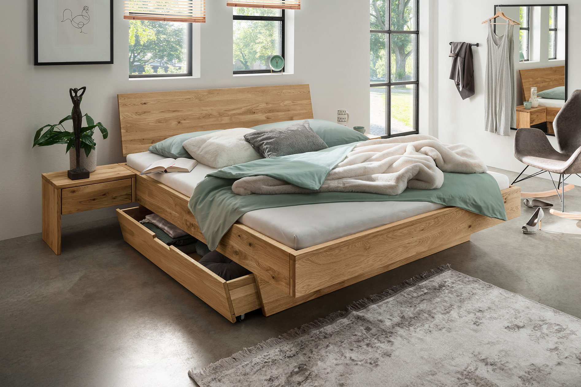 Dieses Bettgestell bietet vielfältige Konfigurationsmöglichkeiten, um Ihren individuellen Wünschen gerecht zu werden: Sie haben die Wahl zwischen verschiedenen Kopfteilen aus Massivholz oder Stoff, mehreren Fußvarianten und zahlreichen Maßen. Außerdem ist das Bettgestell Redwood in den Holzarten Wildeiche und Kernbuche erhältlich.