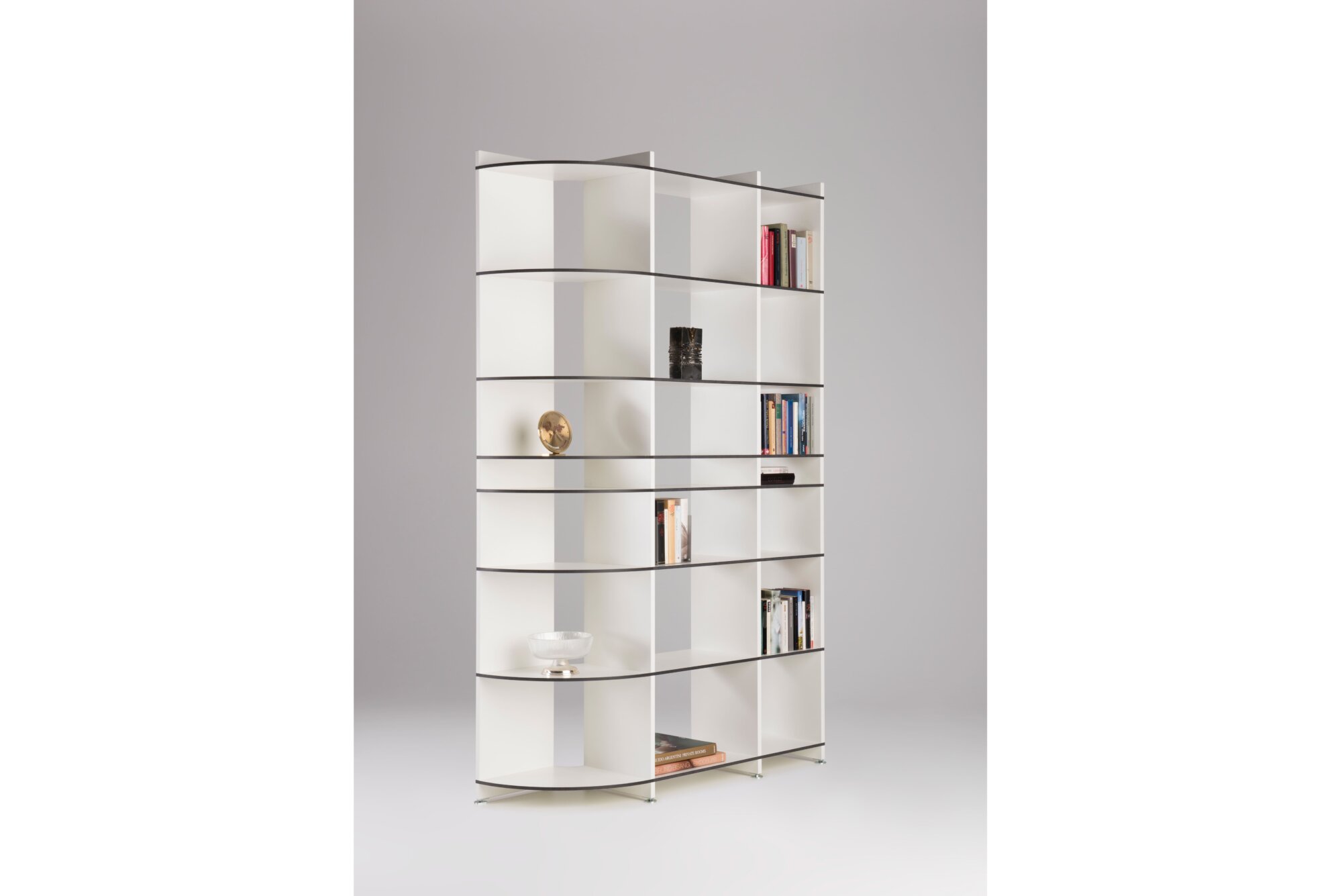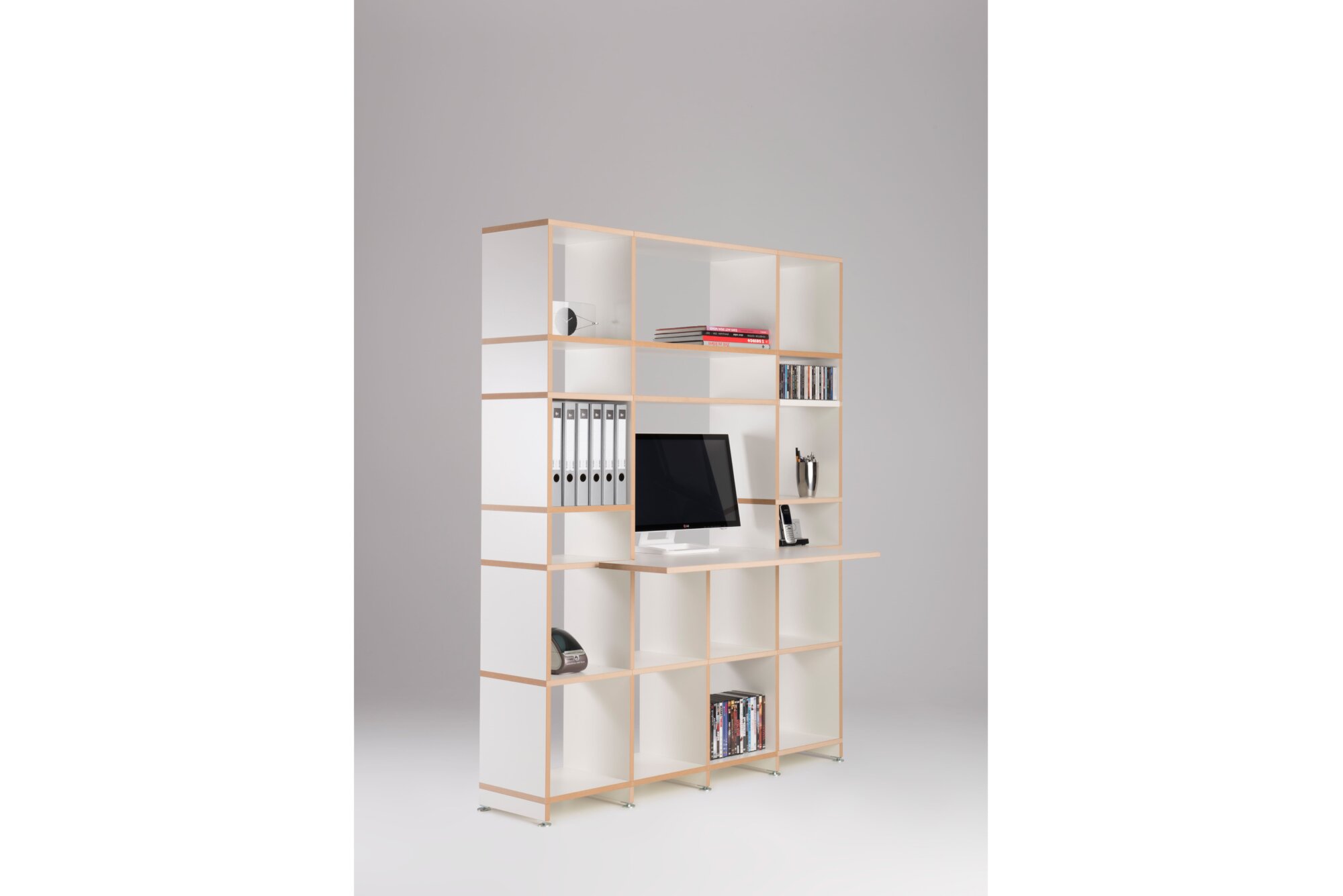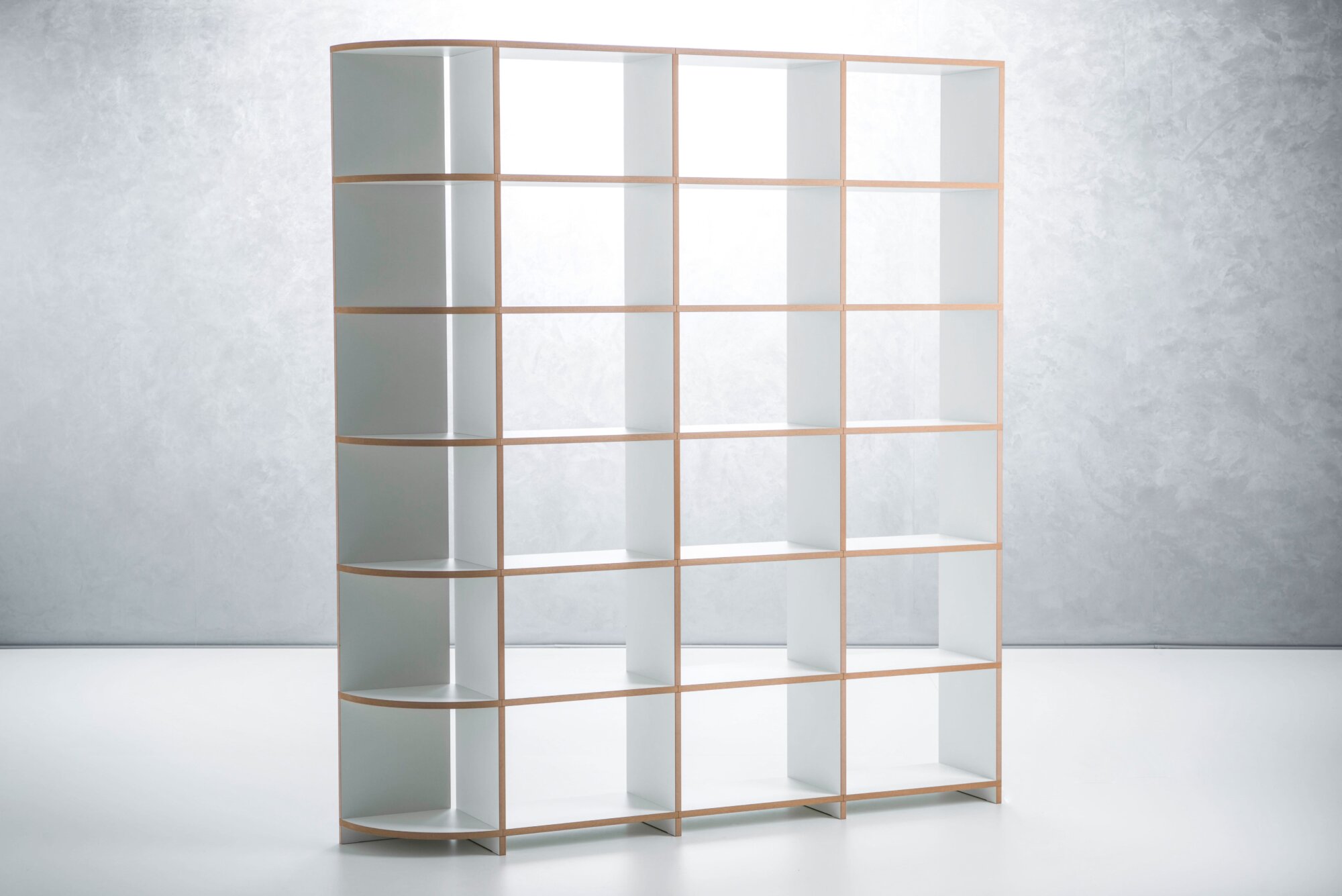 Mit Mocoba können Sie auch um die Ecke planen. Mit zwei Eckböden in 90° und 135° und eckiger oder runder Kante werden Überecklösungen möglich. Sogar als Raumteiler ist Mocoba einsetzbar, da das Regalsystem stabil konstruiert ist.