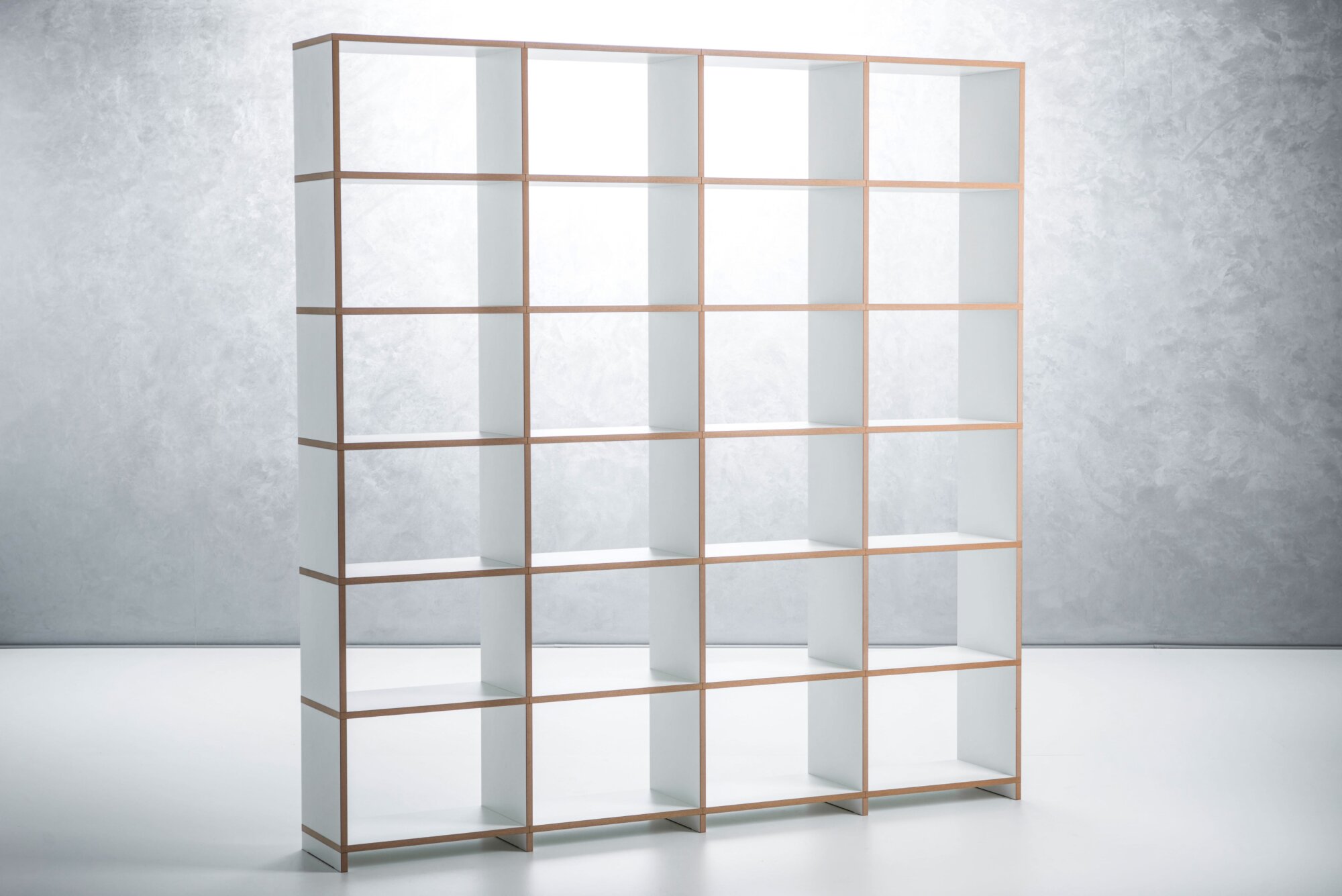 Die hochqualitativen MDF Platten sind besonders fest und mit einer kratzfesten Melaminschicht versehen. Die Platten sind mit massiven Metallstiften von acht Millimeter Durchmesser verbunden. Die Konstruktion verschwindet in den Seitenwangen, ohne erforderliche Stabilisierungskreuze. Höhen von bis zu sechs Metern können konstruiert werden!