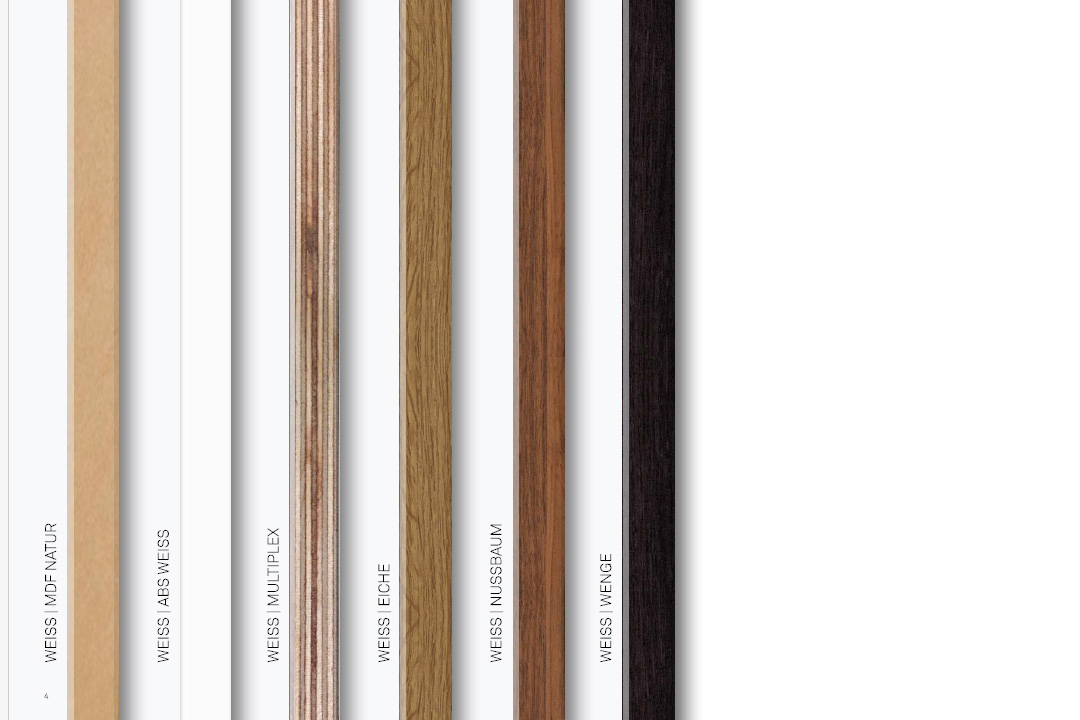 Bei dem Regalsystem handelt es sich um melaminbeschichtete MDF-Platten mit vielen möglichen Kantenfarben (Echtholzfurniere und Multiplex). Planbar in den Breiten 58 - 490 cm, Höhen 58 - 310 cm und mit der Tiefe 37 cm.