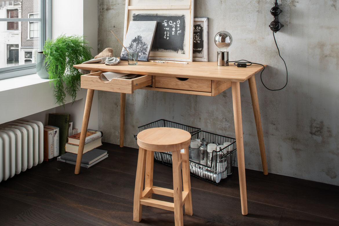 Der Schreibtisch Verona ist ein hochwertig verarbeitetes Möbelstück aus massivem Eichenholz, das mit Öl behandelt wurde. Mit seinen Maßen von 120 cm Breite, 74 cm Höhe und 55 cm Tiefe bietet er ausreichend Platz zum Arbeiten und Organisieren.