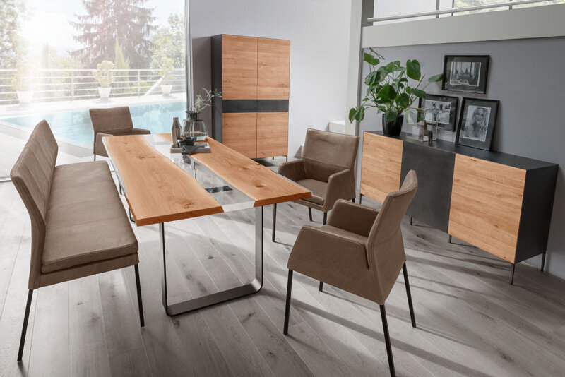 Hoher Komfort trifft auf ein besonderes und schlichtes Design, das zu jeder Einrichtiung passt. Beim hochwertigen Wohnprogramm "Ortello" sind grifflose Fronten mit "Push-to-Open", sowie Schubladen mit gedämpften Selbsteinzügen standard. Mit handgeschliffenen und handpolierten Risskanten und Fronten mit horizontal-durchgehender Maserungslauf.
